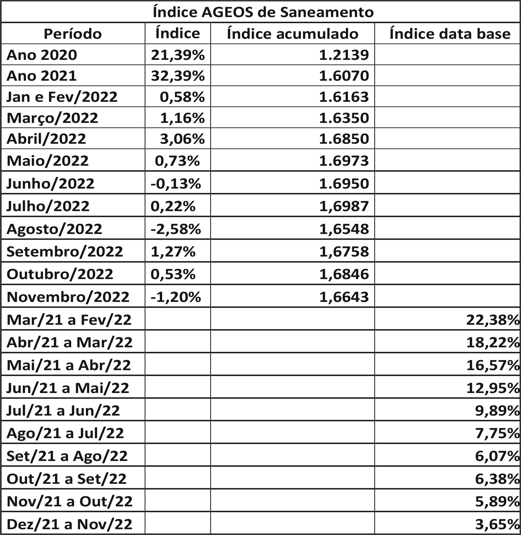 Atualizamos até Novembro de 2022 a planilha do IAS – Índice AGEOS de Saneamento. Estudo criado com o intuito de informar o mercado do Saneamento Básico do Rio Grande do Sul, mais especificamente o de Água e Esgotos sobre a variação dos custos dos principais insumos utilizados na execução das obras.
